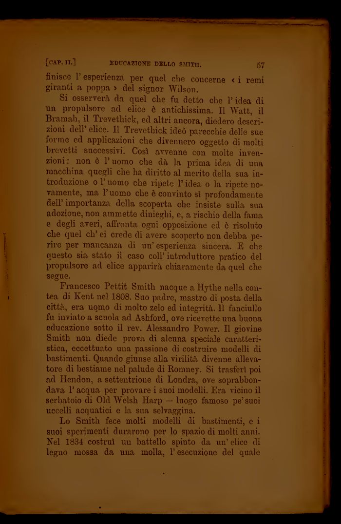 Lo Smith fece molti modelli eli bastimenti, e i suoi sperimenti durarono per lo spazio di molti anni. Nel 1834 costruì un battello spinto da un' elice di legno mossa da una molla, l'esecuzione del quale
