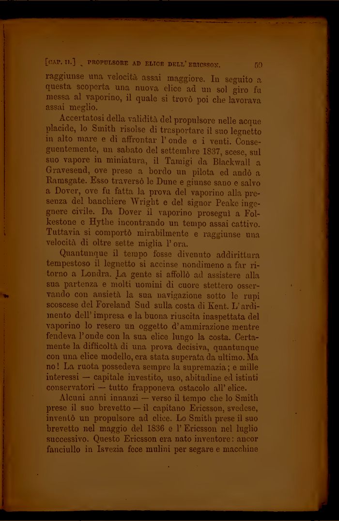 Alcuni anni innanzi — verso il tempo che lo Smith prese il suo brevetto — il capitano Ericsson, svedese, inventò un propulsore ad elice. Lo Smith prese il suo brevetto nel maggio del 1S36 e 1' Ericsson nel luglio successivo. Questo Ericsson era nato inventore : ancor fanciullo in Isvezia fece mulini per segare e macchine