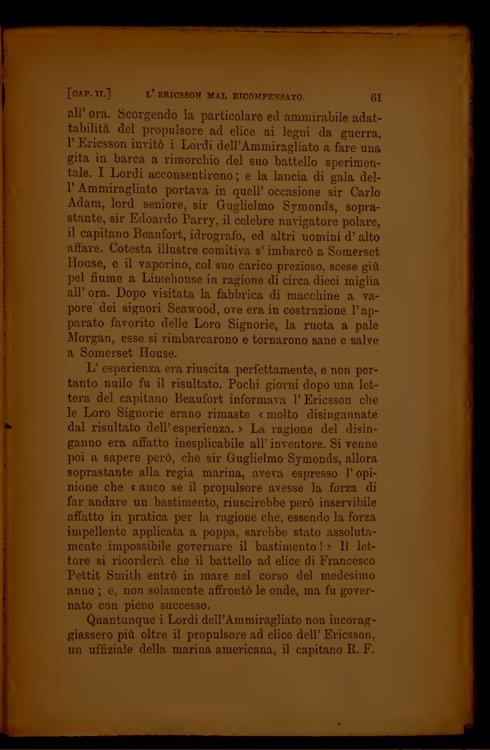 Quantunque i Lordi dell'Ammiragliato non incoraggiassero più oltre il propulsore ad elice dell' Ericsson, un uffiziale della marina americana, il capitano R. F.
