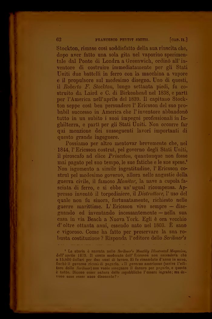 Stockton, rimase così soddisfatto della sua riuscita che, dopo aver fatto una sola gita nel vaporino sperimentale dal Ponte di Londra a Greenwich, ordinò all' inventore di costruire immediatamente per gli Stati Uniti due battelli in ferro con la macchina a vapore e il propulsore sul medesimo disegno. Uno di questi, il Roberto F. Stocldon, lungo settanta piedi, fu costruito da Laird e C. di Birkenbead nel 1S3S, e partì per l'America nell'aprile del 1839. Il capitano Stockton seppe così ben persuadere 1' Ericsson del suo pro-babil successo in America che l'inventore abbandonò tutto in un subito i suoi impegni professionali in Inghilterra, e partì per gli Stati Uniti. Non occorre far qui menzione dei susseguenti lavori importanti di questo grande ingegnere.