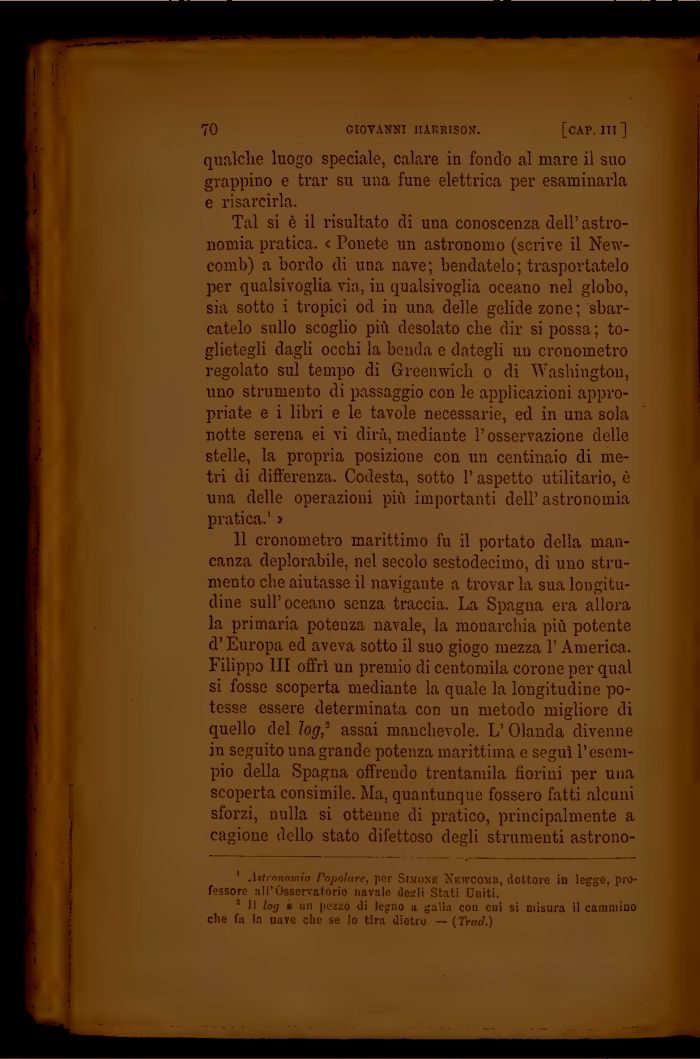 Tal sì è il risultato di una conoscenza dell' astronomia pratica. « Ponete un astronomo (scrive il New-comb) a bordo di una nave; bendatelo ; trasportatelo per qualsivoglia via, in qualsivoglia oceano nel globo, sia sotto i tropici od in una delle gelide zone ; sbarcatelo sullo scoglio più desolato che dir si possa ; toglietegli dagli occhi la benda e dategli un cronometro regolato sul tempo di Greenwich o di Washington, uno strumento di passaggio con le applicazioni appropriate e i libri e le tavole necessarie, ed in una sola notte serena ei vi dirà, mediante l'osservazione delle stelle, la propria posizione con un centinaio di metri di differenza. Codesta, sotto l'aspetto utilitario, è una delle operazioni più importanti dell' astronomia pratica.' >