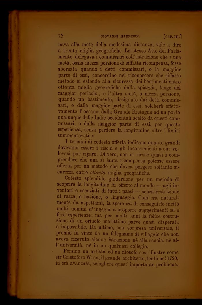 Cotesto splendido guiderdone per un metodo eli scoprire la longitudine fu offerto al mondo — agli inventori e scenziati di tutti i paesi — senza restrizione di razza, o nazione, o linguaggio. Com'era naturalmente da aspettarsi, la speranza di conseguirlo incitò molti uomini d'ingegno a proporre suggerimenti ed a fare esperienze; ma per molti anni la felice costruzione di un oriuolo marittimo parve quasi disperata e impossibile. Da ultimo, con sorpresa universale, il premio fu vinto da un falegname di villaggio che non aveva ricevuto alcuna istruzione nè alla scuola, nè all' università, nè in un qualsiasi collegio.