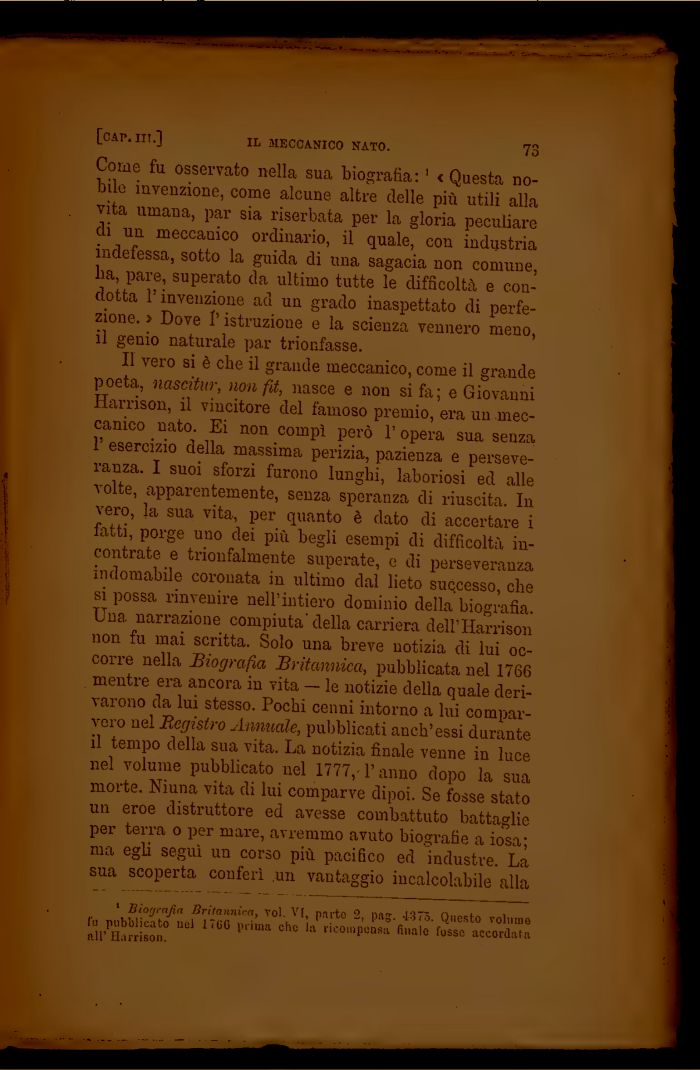 Il vero si è che il grande meccanico, come il grande poeta, nascitur, non fd, nasce e non si fa; e Giovanni Harrison, il vincitore del famoso premio, era un meccanico nato. Ei non compì però l'opera sua senza 1' esercizio della massima perizia, pazienza e perseveranza. I suoi sforzi furono lunghi, laboriosi ed alle volte, apparentemente, senza speranza di riuscita. In vero, ]a sua vita, per quanto è dato di accertare i fatti, porge uno dei più begli esempi di difficoltà incontrate e trionfalmente superate, e di perseveranza indomabile coronata in ultimo dal lieto successo, che si possa rinvenire nell'intiero dominio della biografia. Una narrazione compiuta' della carriera dell'Harrison non fu mai scritta. Solo una breve notizia di lui occorre nella Biografia Britannica, pubblicata nel 1766 mentre era ancora in vita — le notizie della quale derivarono da lui stesso. Pochi cenni intorno a lui comparvero nel Registro Annuale, pubblicati anch'essi durante il tempo della sua vita. La notizia finale venne in luce nel volume pubblicato nel 1777,-1' anno dopo la sua morte. Niuna vita di lui comparve dipoi. Se fosse stato un eroe distruttore ed avesse combattuto battaglie per terra o per mare, avremmo avuto biografie a iosa; ma egli seguì un corso più pacifico ed industre. La sua scoperta conferì .un vantaggio incalcolabile alla