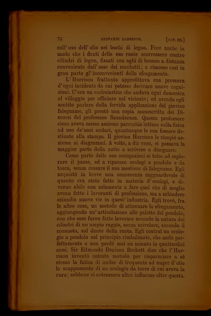 L'Harrisou frattanto approfittava con premura d'ogni incidente da cui potesse derivare nuove cognizioni. C'era un ecclesiastico che andava ogni domenica al villaggio per officiare nel vicinato; ed avendo egli sentito parlare della fervida applicazione del giovine falegname, gli prestò una copia manoscritta dei Discorsi del professore Saunderson. Questo professore cieco aveva messo assieme parecchie letture sulla fisica ad uso de'suoi scolari, quantunque le non fossero destinate alla stampa. Il giovine Ilarrison le ricopiò assieme ai diagrammi. A volte, a dir vero, ei passava la maggior parte della notte a scrivere o disegnare.