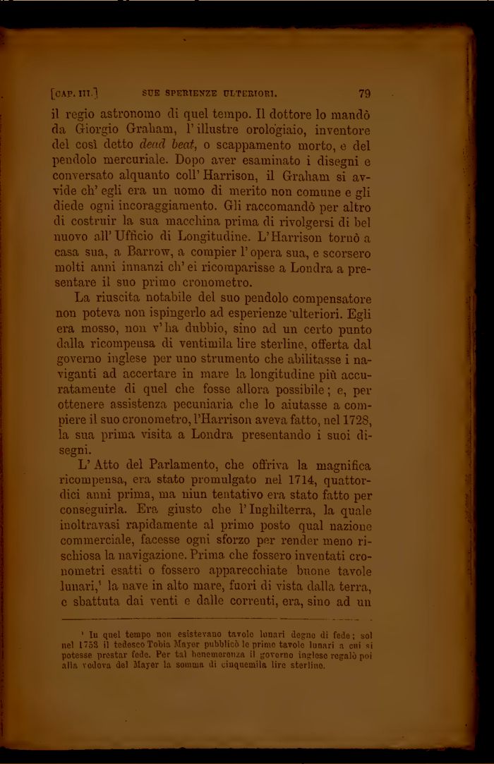 L' Atto del Parlamento, che offriva la magnifica ricompensa, era stato promulgato nel 1714, quattordici anni prima, ma niun tentativo era stato fatto per conseguirla. Era giusto che l'Inghilterra, la quale inoltravasi rapidamente al primo posto qual nazione commerciale, facesse ogni sforzo per render meno rischiosa la navigazione. Prima che fossero inventati cronometri esatti o fossero apparecchiate buone tavole lunari,' la nave in alto mare, fuori di vista dalla terra, e sbattuta dai venti e dalle correnti, era, sino ad un