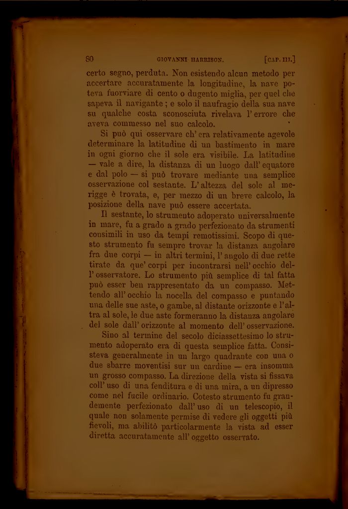 Si può qui osservare eh' era relativamente agevole determinare la latitudine di un bastimento in mare in ogni giorno che il sole era visibile. La latitudine — vale a dire, la distanza di un luogo dall' equatore e dal polo — si può trovare mediante una semplice osservazione col sestante. L'altezza del sole al merigge è trovata, e, per mezzo di un breve calcolo, la posizione della nave può essere accertata.