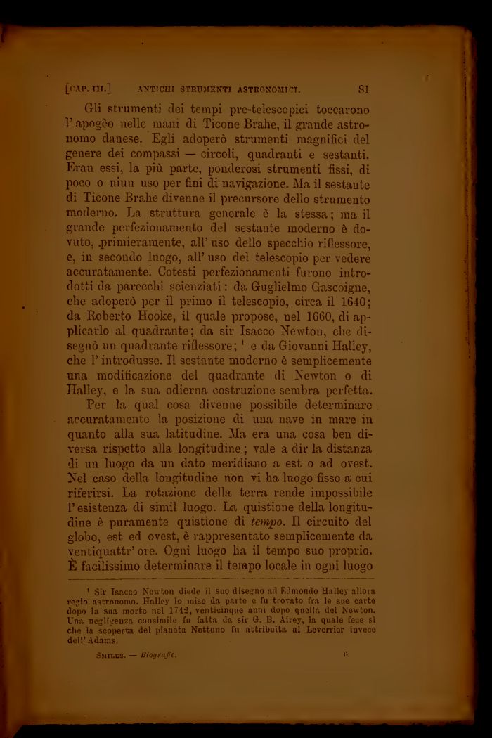Gli strumenti dei tempi pre-telescopici toccarono 1' apogèo nelle mani di Ticone Brahe, il grande astronomo danese. Egli adoperò strumenti magnifici del genere dei compassi — circoli, quadranti e sestanti. Eran essi, la più parte, ponderosi strumenti fissi, di poco o ni un uso per fini di navigazione. Ma il sestaute di Ticone Brahe divenne il precursore dello strumento moderno. La struttura generale è la stessa ; ma il grande perfezionamento del sestante moderno è dovuto, .primieramente, all' uso dello specchio riflessore, e, in secondo luogo, all' uso del telescopio per vedere accuratamente. Cotesti perfezionamenti furono introdotti da parecchi scienziati : da Guglielmo Gascoigne, che adoperò per il primo il telescopio, circa il 1640; da Roberto Hooke, il quale propose, nel 1660, di applicarlo al quadrante; da sir Isacco Newton, che disegnò un quadrante riflessore; 1 e da Giovanni Halley, che l'introdusse. Il sestante moderno è semplicemente una modificazione del quadrante di Newton o di Iialley, e la sua odierna costruzione sembra perfetta.
