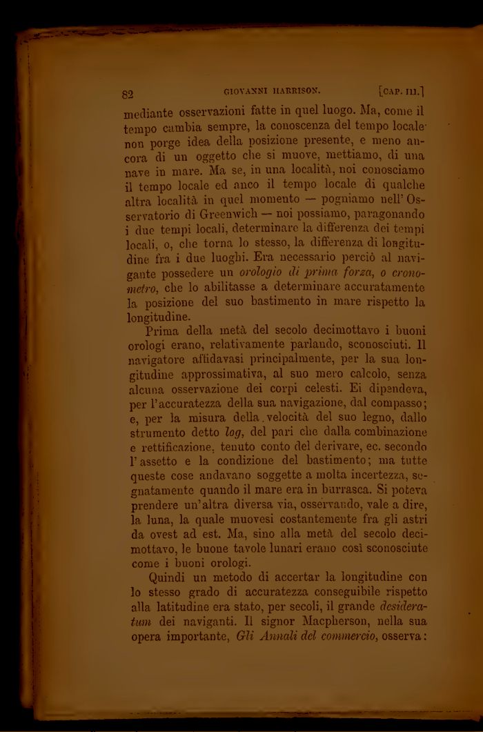 Quindi un metodo di accertar la longitudine con lo stesso grado di accuratezza conseguibile rispetto alla latitudine era stato, per secoli, il grande desideratimi dei naviganti. Il signor Macpherson, nella sua opera importante, Gli Annali del commercio, osserva :