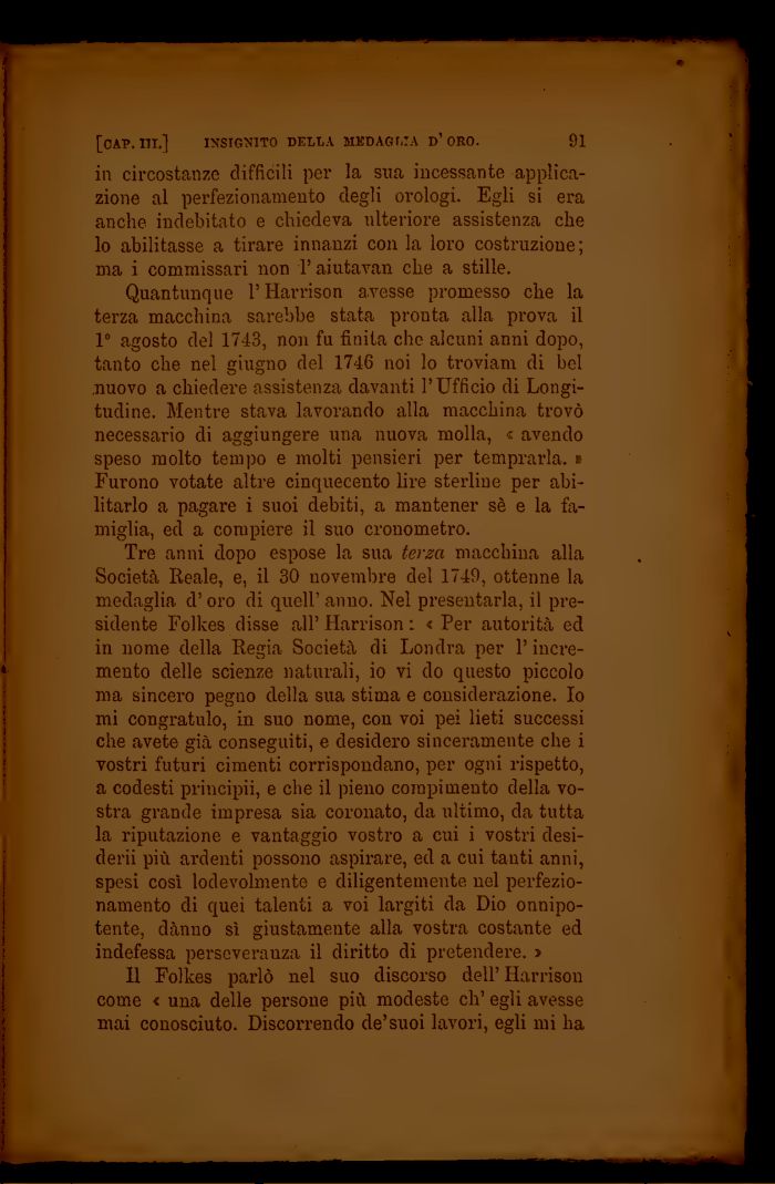Tre anni dopo espose la sua terza macchina alla Società Reale, e, il 30 novembre del 1749, ottenne la medaglia d'oro di quell'anno. Nel presentarla, il presidente Follces disse all' Harrison : « Per autorità ed in nome della Regia Società di Londra per l'incremento delle scienze naturali, io vi do questo piccolo ma sincero pegno della sua stima e considerazione. Io mi congratulo, in suo nome, con voi pei lieti successi che avete già conseguiti, e desidero sinceramente che i vostri futuri cimenti corrispondano, per ogni rispetto, a codesti principii, e che il pieno compimento della vostra grande impresa sia coronato, da ultimo, da tutta la riputazione e vantaggio vostro a cui i vostri desidera più ardenti possono aspirare, ed a cui tanti anni, spesi così lodevolmente e diligentemente nel perfezionamento di quei talenti a voi largiti da Dio onnipotente, dànno sì giustamente alla vostra costante ed indefessa perseverauza il diritto di pretendere. >