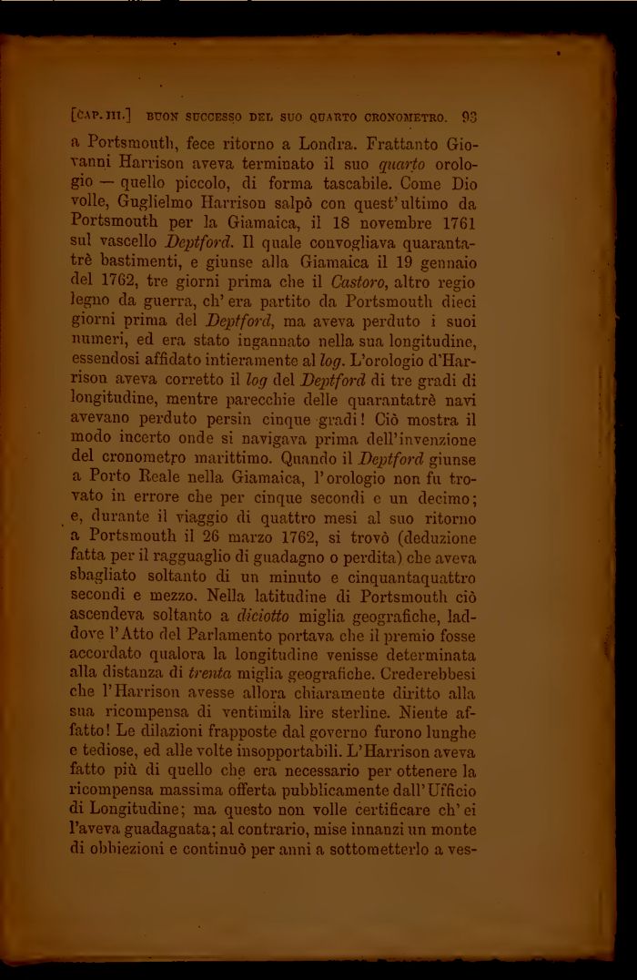 a Portsmouth, fece ritorno a Londra. Frattanto Giovanni Harrison aveva terminato il suo quarto orologio — quello piccolo, di forma tascabile. Come Dio volle, Guglielmo Harrison salpò con quest'ultimo da Portsmouth per la Giamaica, il 18 novembre 1761 sul vascello Deptford. Il quale convogliava quaranta-tré bastimenti, e giunse alla Giamaica il 19 gennaio del 1762, tre giorni prima che il Castoro, altro regio legno da guerra, eh' era partito da Portsmouth dieci giorni prima del Deptford, ma aveva perduto i suoi numeri, ed era stato ingannato nella sua longitudine, essendosi affidato intieramente al log. L'orologio d'Har-rison aveva corretto il log del Deptford di tre gradi di longitudine, mentre parecchie delle quarantatre navi avevano perduto persili cinque gradi ! Ciò mostra il modo incerto onde si navigava prima dell'invenzione del cronometro marittimo. Quando il Deptford giunse a Porto Reale nella Giamaica, l'orologio non fu trovato in errore che per cinque secondi e un decimo; e, durante il viaggio di quattro mesi al suo ritorno a Portsmouth il 26 marzo 1762, si trovò (deduzione fatta per il ragguaglio di guadagno o perdita) che aveva sbagliato soltanto di un minuto e cinquantaquattro secondi e mezzo. Nella latitudine di Portsmouth ciò ascendeva soltanto a diciotto miglia geografiche, laddove l'Atto del Parlamento portava che il premio fosse accordato qualora la longitudine venisse determinata alla distanza di trenta miglia geografiche. Crederebbesi che l'Harrison avesse allora chiaramente diritto alla sua ricompensa di ventimila lire sterline. Niente affatto! Le dilazioni frapposte dal governo furono lunghe e tediose, ed alle volte insopportabili. L'Harrison aveva fatto più di quello che era necessario per ottenere la ricompensa massima offerta pubblicamente dall'Ufficio di Longitudine; ma questo non volle certificare eh'ei l'aveva guadagnata; al contrario, mise innanzi un monte di obbiezioni e continuò per anni a sottometterlo a ves-
