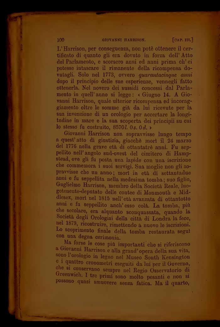 L'Harrison, per conseguenza, non potè ottenere il certificato di quanto gli era dovuto in forza dell' Atto del Parlamento, e scorsero anni ed anni prima eh' ei potesse intascare il rimanente della ricompensa dovutagli. Solo nel 1773, ovvero quarantacinque anni dopo il principio delle sue esperienze, vennegli fatto ottenerla. Nel novero dei sussidi concessi dal Parlamento in quell' anno si legge : < Giugno 14. A Giovanni Harrison, quale uiterior ricompensa ed incoraggiamento oltre le somme già da lui ricevute per la sua invenzione di un orologio per accertare la longitudine in mare e la sua scoperta dei principii su cui lo stesso fu costruito, 8570l. Os. Od. »