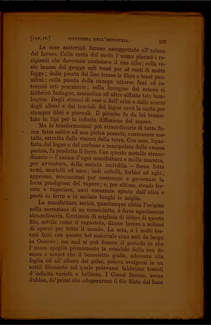 Ma le trasformazioni più straordinarie di tutte furon fatte subire ad una pietra pesante, contenente metallo, estratta dalle viscere della terra. Con essa, liquefatta dal legno o dal carbone e manipolata dalla umana perizia, fu prodotto il ferro. Con questo metallo straordinario — l'anima d'ogni manifattura e molla maestra, per avventura, della società incivilita — furon fatte armi, martelli ed asce; indi coltelli, forbici ed aghi; appresso, meccanismi per contenere e governare la forza prodigiosa del vapore ; e, per ultimo, strade ferrate e vaporiere, navi corazzate spinte dall' elice e ponti in ferro e in acciaio lunghi le miglia.