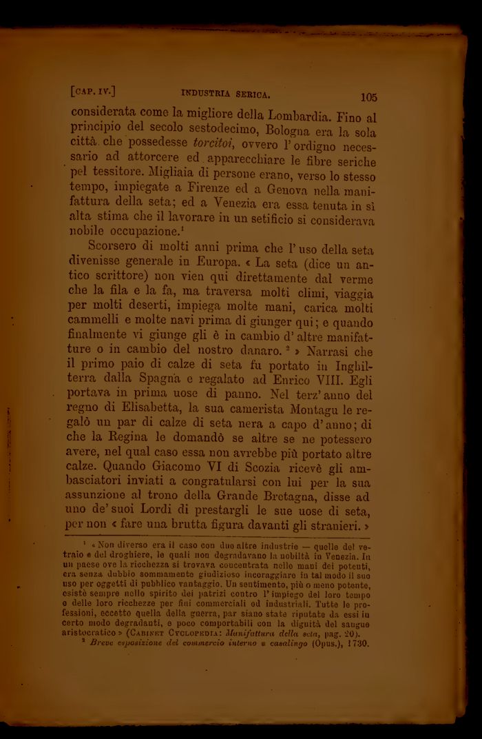 considerata come la migliore della Lombardia. Fino al principio del secolo sestodecimo, Bologna era la sola città che possedesse torcitoi, ovvero l'ordigno necessario ad attorcere ed apparecchiare le fibre seriche pel tessitore. Migliaia di persone erano, verso lo stesso tempo, impiegate a Firenze ed a Genova nella manifattura della seta; ed a Venezia era essa tenuta in sì alta stima che il lavorare in un setificio sì considerava nobile occupazione.1