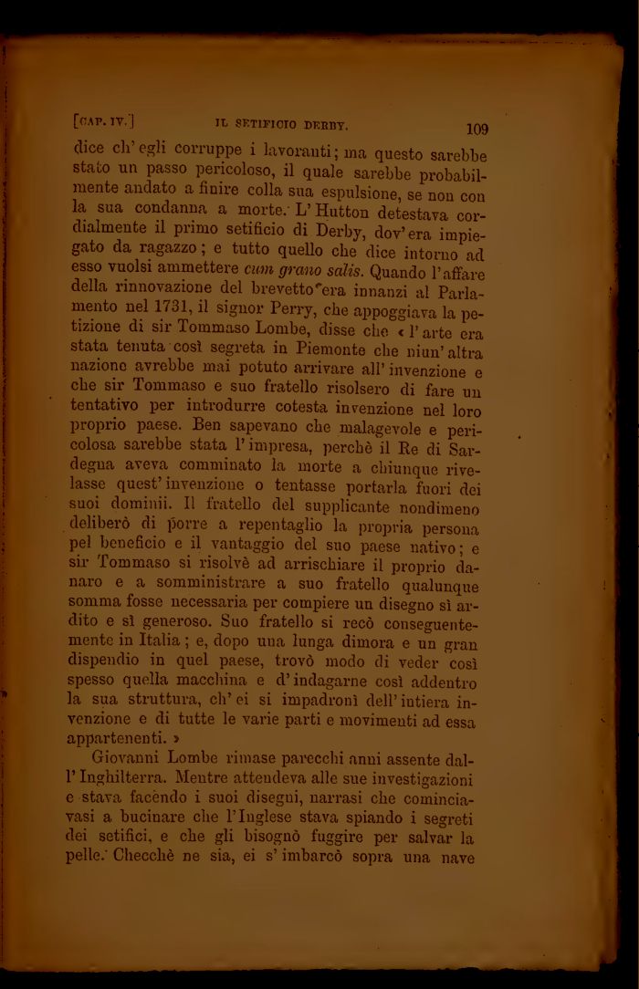 dice eli' egli corruppe i lavoranti ; ma questo sarebbe stato un passo pericoloso, il quale sarebbe probabilmente andato a finire colla sua espulsione, se non con la sua condanna a morte.' L'Hutton detestava cordialmente il primo setificio di Derby, dov'era impiegato da ragazzo ; e tutto quello che dice intorno ad esso vuoisi ammettere cum grano salis. Quando l'affare della rinnovazione del brevetto rera innanzi al Parlamento nel 1731, il signor Perry, che appoggiava la petizione di sir Tommaso Lombe, disse che c l'arte era stata tenuta così segreta in Piemonte che mun'altra nazione avrebbe mai potuto arrivare all' invenzione e che sir Tommaso e suo fratello risolsero di fare un tentativo per introdurre cotesta invenzione nel loro proprio paese. Ben sapevano che malagevole e pericolosa sarebbe stata l'impresa, perchè il Re di Sardegna aveva comminato la morte a chiunque rivelasse quest' invenzione o tentasse portarla fuori dei suoi dominii. Il fratello del supplicante nondimeno deliberò di porre a repentaglio la propria persona pel beneficio e il vantaggio del suo paese nativo; e sir Tommaso si risolvè ad arrischiare il proprio danaro e a somministrare a suo fratello qualunque somma fosse necessaria per compiere un disegno sì ardito e sì generoso. Suo fratello si recò conseguentemente in Italia ; e, dopo una lunga dimora e un gran dispendio in quel paese, trovò modo di veder così spesso quella macchina e d'indagarne così addentro la sua struttura, eh' ei si impadronì dell' intiera invenzione e di tutte le varie parti e movimenti ad essa appartenenti. »