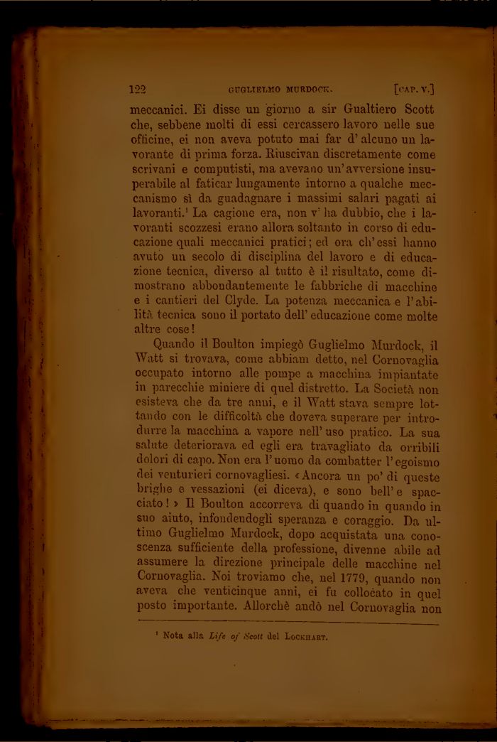 Quando il Boulton impiegò Guglielmo Murdoch, il Watt si trovava, come abbiam detto, nel Corno vaglia occupato intorno alle pompe a macchina impiantate in parecchie miniere di quel distretto. La Società non esisteva che da tre anni, e il Watt stava sempre lottando con le difficoltà che doveva superare per introdurre la macchina a vapore nell' uso pratico. La sua salute deteriorava ed egli era travagliato da orribili dolori di capo. Non era l'uomo da combatter l'egoismo dei venturieri cornovagliesi. « Ancora un po'di queste brighe e vessazioni (ei diceva), e sono beli' e spacciato ! > B Boulton accorreva di quando in quando in suo aiuto, infondendogli speranza e coraggio. Da ultimo Guglielmo Murdock, dopo acquistata una conoscenza sufficiente della professione, divenne abile ad assumere la direzione principale delle macchine nel Cornovaglia. Noi troviamo che, nel 1779, quando non aveva che venticinque anni, ei fu collocato in quel posto importante. Allorché andò nel Cornovaglia non