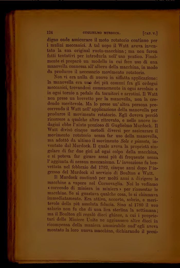 Il Murdock continuò per molti anni a dirigere le macchine a vapore nel Cornovaglia. Noi lo vediamo « correndo di miniera in miniera > per riassestar le macchine. Se si guastava qualche cosa, lo si chiamava immediatamente. Era attivo, accorto, sobrio, e meritevole della più assoluta fiducia. Sino al 17S0 il suo salario non fu che di una lira sterlina la settimana; ma il Boulton gli regalò dieci ghinee, a cui i proprietari delle Miniere Unite ne aggiunsero altre dieci in ricompensa della maniera ammirabile onci' egli aveva montato la loro nuova macchina, dichiarando il presi-