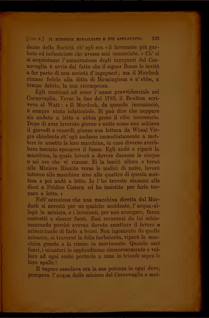 Egli continuò ad esser l'uomo provvidenziale nel Cornovaglia. Verso la fine del 1782, il Boulton scriveva al Watt : « 11 Murdock, da quando incominciò, è sempre stato infaticabile. Si può dire che neppure sia andato a letto o abbia preso il cibo necessario. Dopo di aver lavorato giorno e notte come uno schiavo il giovedì e venerdì, giunse una lettera da Wheal Virgin chiedente eh' egli andasse immediatamente a mettere in assetto la loro macchina, in caso diverso avrebbero lasciato spengere il fuoco. Egli andò e riparò la macchina, la quale lavorò a dovere durante le cinque o sei ore che vi rimase. Ei la lasciò allora e 'tornò alle Miniere Riunite verso le undici di notte, lavorò intorno alle macchine sino alle quattro di questa mattina e poi andò a letto. Io l'ho trovato stamani alle dieci a Poldice Cistern ed ho insistito per farlo tornare a letto. >