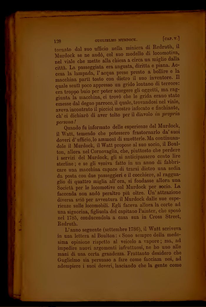tornato dal suo ufficio uella miniera di Redruth, il Murdock se ne andò, col suo modello di locomotiva, nel viale che mette alla chiesa a circa un miglio dalla città. La passeggiata era angusta, diritta e piana. Accesa la lampada, 1' acqua prese presto a bollire e la macchina parti tosto con dietro il suo inventore. Il quale sentì poco appresso un grido lontano di terrore: era troppo buio per poter scorgere gli oggetti, ma raggiunta la macchina, ei trovò che le grida erano state emesse dal degno parroco, il quale, trovandosi nel viale, aveva incontrato il picciol mostro infocato e fischiante, eh' ei dichiarò di aver tolto per il diavolo in propria persona !