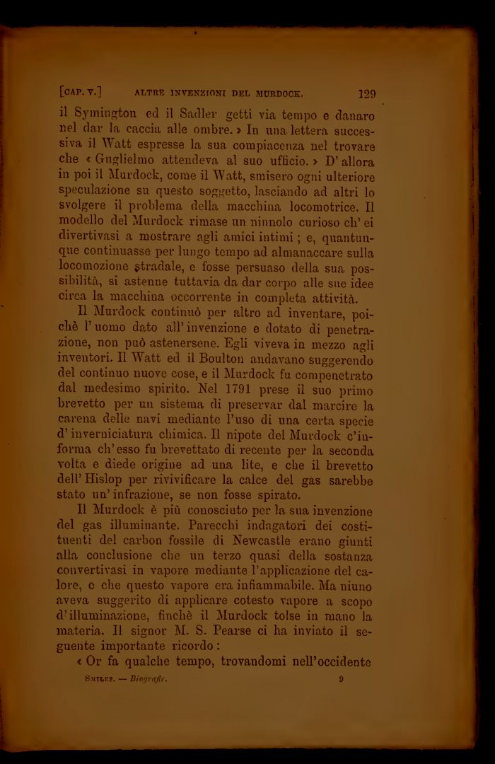 il Symington ecl il Sadler getti via tempo e danaro nel dar la eaccia alle ombre. » In una lettera successiva il Watt espresse la sua compiacenza nel trovare che « Guglielmo attendeva al suo ufficio. > D' allora in poi il Murdock, come il Watt, smisero ogni ulteriore speculazione su questo soggetto, lasciando ad altri lo svolgere il problema della macchina locomotrice. Il modello del Murdock rimase un ninnolo curioso eh' ei divertivasi a mostrare agli amici intimi ; e, quantunque continuasse per lungo tempo ad almanaccare sulla locomozione stradale, e fosse persuaso della sua possibilità, si astenne tuttavia da dar corpo alle sue idee circa la macchina occorrente in completa attività.