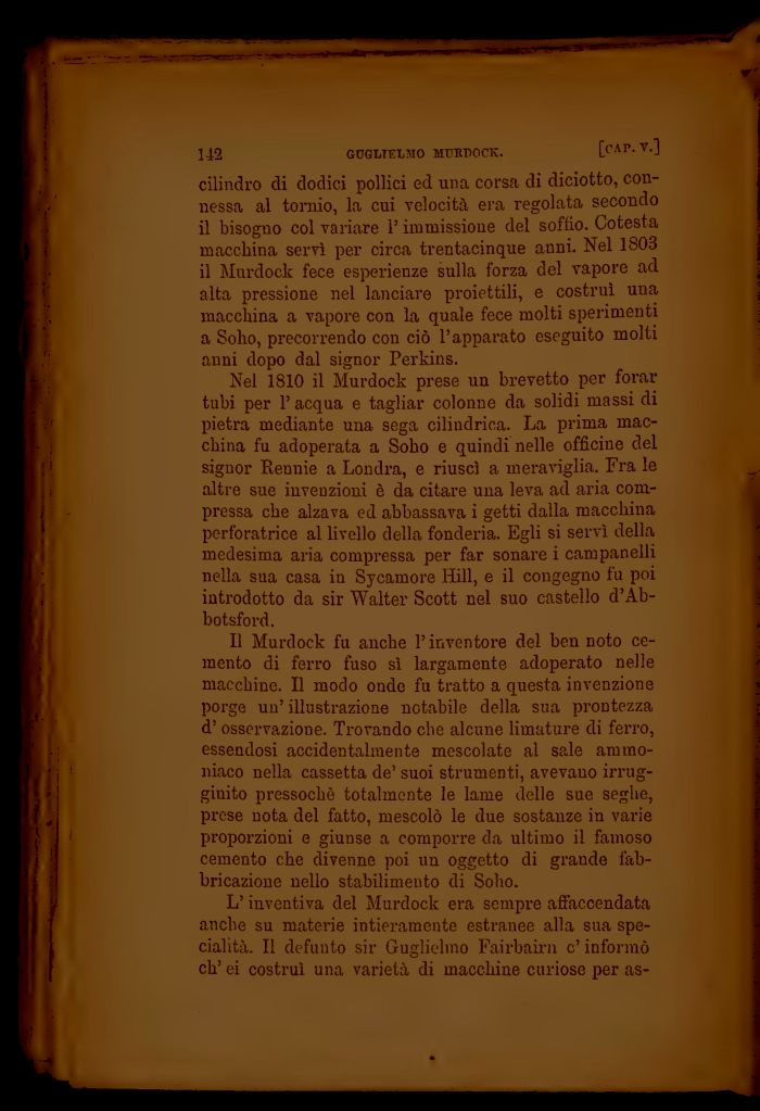 cilindro di dodici pollici ed una corsa di diciotto, connessa al tornio, la cui velocità era regolata secondo il bisogno col variare l'immissione del soffio. Cotesta macchina servì per circa trentacinque anni. Nel 1803 il Murdock fece esperienze sulla forza del vapore ad alta pressione nel lanciare proiettili, e costruì una macchina a vapore con la quale fece molti sperimenti a Soho, precorrendo con ciò l'apparato eseguito molti anni dopo dal signor Perkins.