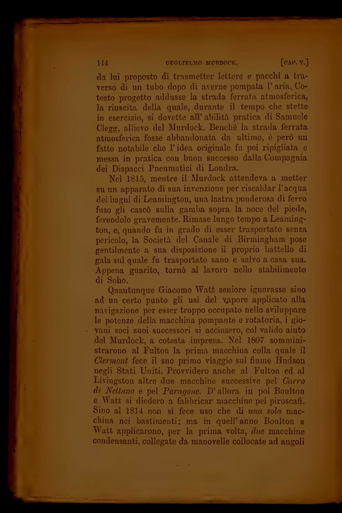 Quantunque Giacomo Watt seniore ignorasse sino ad un certo punto gli usi del vapore applicato alla navigazione per esser troppo occupato nello sviluppare le potenze della macchina pompante e rotatoria, i giovani soci suoi successori si accinsero, col valido aiuto del Murdock, a cotesta impresa. Nel 1807 somministrarono al Fulton la prima macchina colla quale il Clermont fece il suo primo viaggio sul fiume Hudson negli Stati Uniti. Provvidero anche al Fulton ed al Livingston altre due macchine successive pel Carro di Nettuno e pel Paragone. D'allora in poi Boulton e Watt si diedero a fabbricar macchine pei piroscafi. Sino al 1814 non si fece uso che di una sola macchina nei bastimenti; ma in quell'anno Boulton a Watt applicarono, per la prima volta, due macchine condensanti, collegate da manovelle collocate ad angoli
