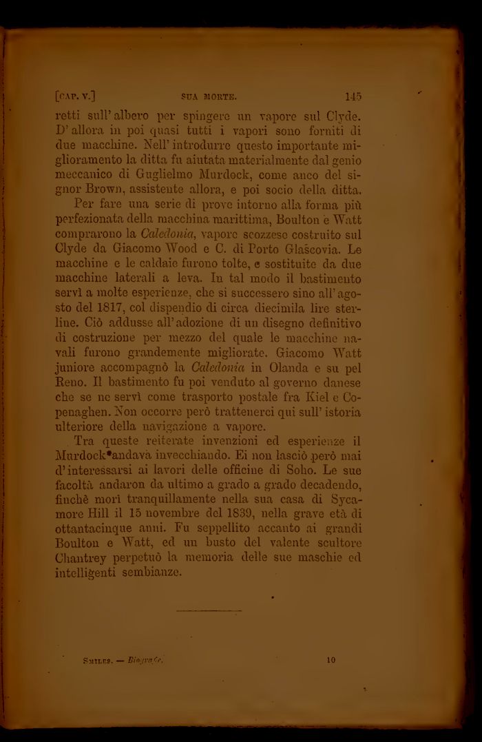 Tra queste reiterate invenzioni ed esperienze il Mnrdock'andavà invecchiando. Ei non lasciò .però mai d'interessarsi ai lavori delle officine di Soho. Le sue facoltà andaron da ultimo a grado a grado decadendo, finché morì tranquillamente nella sua casa di Syca-more Hill il 15 novembre del 1839, nella grave età di ottantacinque anni. Fu seppellito accanto ai grandi Boulton e Watt, ed un busto del valente scultore Chantrey perpetuò la memoria delle sue maschie ed intelligenti sembianze.
