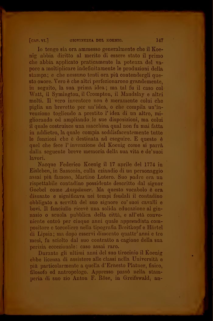 Io tengo sia ora ammesso generalmente che il Koe-nig abbia diritto al merito di essere stato il primo che abbia applicato praticamente la potenza del vapore a moltiplicare indefinitamente le produzioni della stampa; e che nessuno tenti ora più contendergli questo onore. Vero è che altri perfezionarono grandemente, in seguito, la sua prima idea ; ma tal fu il caso col Watt, il Symington, il Crompton, il Maudslay e altri molti. Il vero inventore non è meramente colui che piglia un brevetto per un'idea, o che compila un'invenzione togliendo a prestito l'idea di un altro, migliorando od ampliando.le sue disposizioni, ma colui il quale costruisce una macchina qual non fu mai fatta in addietro, la quale compia soddisfacentemente tutte le funzioni che è destinata ad eseguire. E questo è quel che fece l'invenzione del Ivoenig come si parrà dalla seguente breve memoria della sua vita e de' suoi lavori.