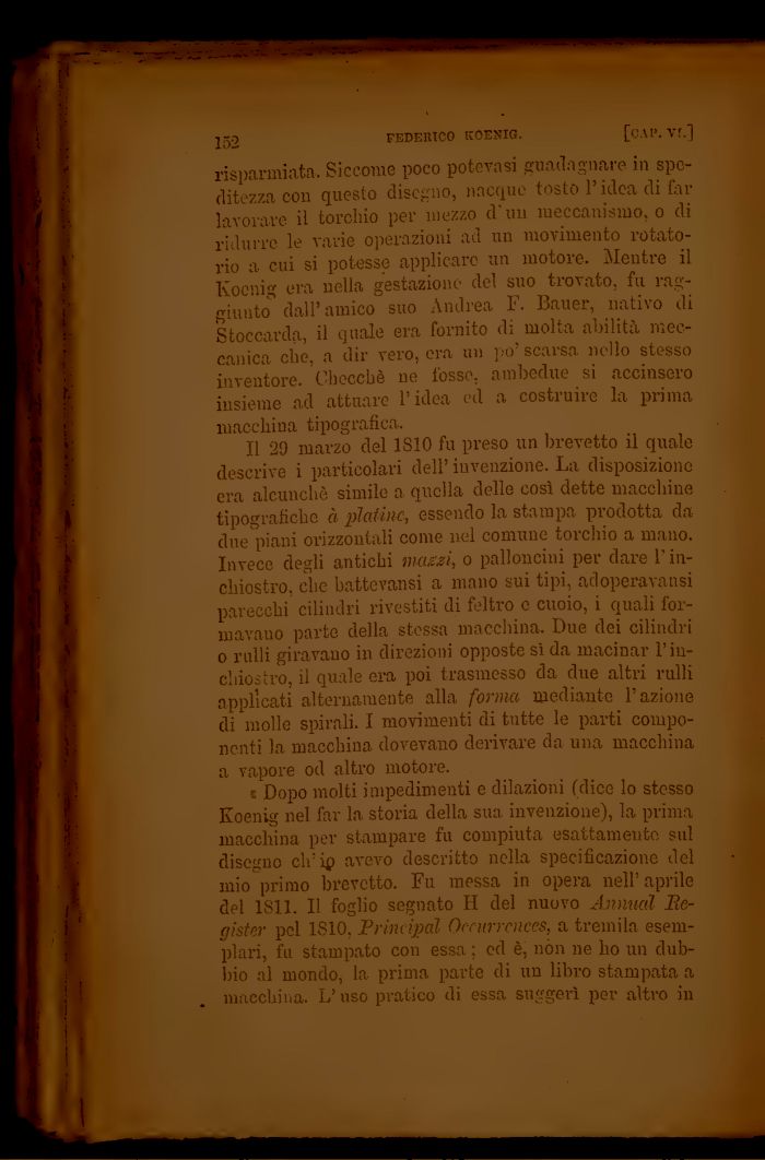 risparmiata. Siccome poco potevasi guadagnare in speditezza con questo disegno, nacque tostò l'idea di far lavorare il torchio per mezzo d'uu meccanismo, o di ridurre le varie operazioni ad un movimento rotatorio a cui si potesse applicare un motore. Mentre il Kocnig era nella gestazione del suo trovato, fu raggiunto dall'amico suo Andrea F. Bauer, nativo di Stoccarda, il quale era fornito di molta abilità meccanica che, a dir vero, era un po' scarsa nello stesso inventore. Checché ne fosse, ambedue si accinsero insieme ad attuare l'idea ed a costruire la prima macchina tipografica.