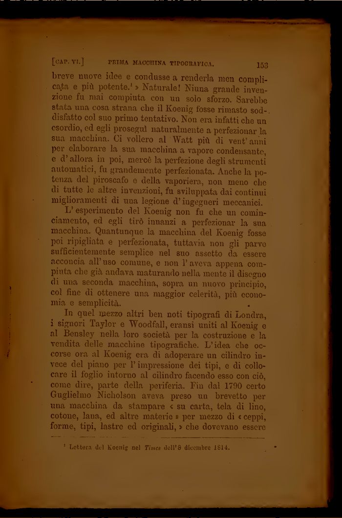 In quel mezzo altri ben noti tipografi di Londra, i signori Taylor e Woodfall, eransi uniti al Koenig e al Bensley nella loro società per la costruzione e la vendita delle macchine tipografiche. L'idea che occorse ora al Koenig era di adoperare un cilindro invece del piano per l'impressione dei tipi, e di collocare il foglio intorno al cilindro facendo esso con ciò, come dire, parte della periferia. Fin dal 1790 certo Guglielmo Nicholson aveva preso un brevetto per una macchina da stampare « su carta, tela di lino, cotone, lana, ed altre materie « per mezzo di « ceppi, forme, tipi, lastre ed originali, > che dovevano essere