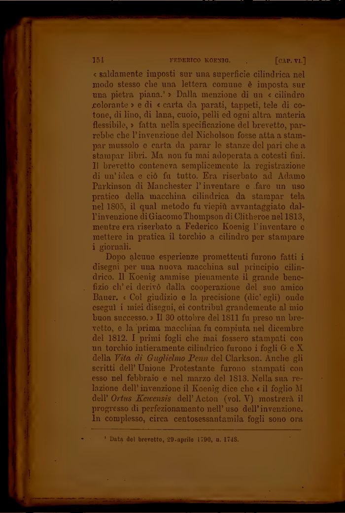 Dopo alcuue esperienze promettenti furono fatti i disegni per una nuova macchina sul principio cilindrico. 11 Koenig ammise pienamente il grande benefizio eh' ei derivò dalla cooperazione del suo amico Bauer. « Col giudizio e la px-ecisione (die' egli) onde eseguì i miei disegni, ei contribuì grandemente al inio buon successo. » Il 30 ottobre del 1S11 fu preso un brevetto, e la prima macchina fu compiuta nel dicembre del 1S12. I primi fogli che mai fossero stampati con un torchio intieramente cilindrico furono i fogli G e X della Vita eli Guglielmo Perni del Clarkson. Anche gli scritti dell' Unione Protestante furono stampati con esso nel febbraio e nel marzo del 1S13. Nella sua relazione dell' invenzione il Koenig dice che < il foglio M dell' Ortus Kewensis dell'Acton (voi. V) mostrerà il progresso di perfezionamento nell' uso dell'invenzione. In complesso, circa centosessantamila fogli sono ora