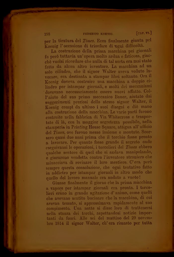 Giunse finalmente il giorno che la prima macchina a vapore per istampar giornali era pronta. I torcolieri erano in grande agitazione d'animo, come quelli che avevano sentito bucinare che la macchina, di cui avevan temuto, si approssimava rapidamente al suo compimento. Una notte si disse loro di trattenersi nella stanza dei torchi, aspettandosi notizie importanti da fuori. Alle sei del mattino del 29 novembre 1814 il signor Walter, eli' era rimasto per tutta