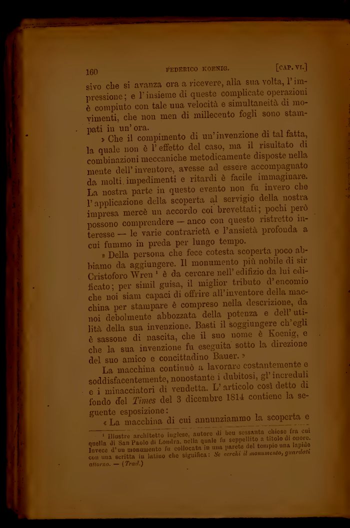 » Della persona che fece cotesta scoperta poco abbiamo da aggiungere. Il monumento più nobile di sir Cristoforo Wren 1 è da cercare nell' edifìzio da lui edificato; per simil guisa, il miglior tributo d'encomio che noi siam capaci di offrire all'inventore della macchina per stampare è compreso nella descrizione, da noi debolmente abbozzata della potenza e dell'utilità della sua invenzione. Basti il soggiungere ch'egli è sassone di nascita, che il suo nome è Koenig, e che la sua invenzione fu eseguita sotto la direzione del suo amico e concittadino Bauer. ?