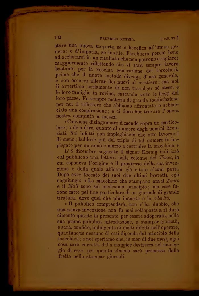 > Il pubblico comprenderà, non v' ha dubbio, che una nuova invenzione non fu mai sottoposta a sì duro cimento quanto la presente, per essere adoperata, nella sua prima pubblica introduzione, a stampar giornali, e sarà, confido, indulgente ai molti difetti nell' operare, quantunque nessuno di essi dipenda dal principio della macchina; e noi speriamo che, in men di due mesi, ogni cosa sarà corretta dalla maggior destrezza nel maneggio di essa, per quanto almeno sarà permesso dalla fretta nello stampar giornali.