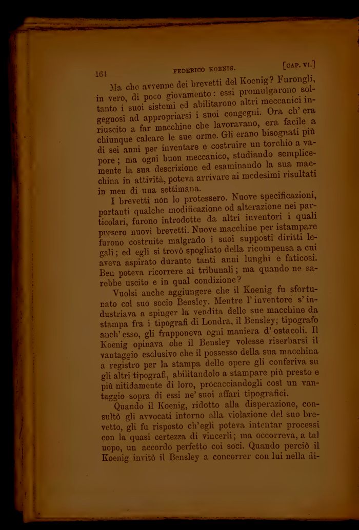 Quando il Koenig, ridotto alla disperazione, consultò gli avvocati intorno alla violazione del suo brevetto, gli fu risposto ch'egli poteva intentar processi con la quasi certezza di vincerli; ma occorreva, a tal uopo, un accordo perfetto coi soci. Quando perciò il Koenig imitò il Bensley a concorrer con lui nella di-