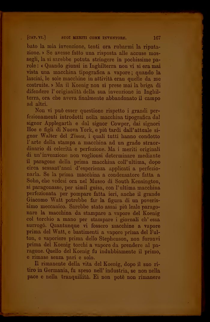 Non vi può esser questione rispetto i grandi perfezionamenti introdotti nella macchina tipografica dal signor Applegarth e dal signor Cowper, dai signori Hoe e figli di Nuova York, e più tardi dall'attuale signor Walter del Times, i quali tutti hanno condotto 1' arte della stampa a macchina ad un grado straordinario di celerità e perfezione. Ma i meriti originali di un'invenzione non vogliousi determinare mediante il paragone della prima macchina coli'ultima, dopo circa sessantanni d'esperienza applicati a perfezionarla. Se la prima macchina a condensatore fatta a Soho, che vedesi ora nel Museo di South Kensingtou, si paragonasse, per simil guisa, con l'ultima macchina perfezionata per pompare fatta ieri, anche il grande Giacomo Watt potrebbe far la figura di un poverissimo meccanico. Sarebbe stato assai più leale paragonare la macchina da stampare a vapore del Koenig col torchio a mano per stampare i giornali eli' essa surrogò. Quantunque vi fossero macchine a vapore prima del Watt, e bastimenti a vapore prima del Ful-ton, e vaporiere prima dello Stephenson, non furonvi prima del Koenig torchi a vapore da prendere al paragone. Quello del Koenig fu indubbiamente il primo, e rimase senza pari e solo.