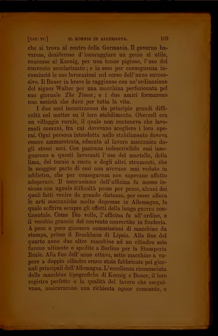 I due soci incontrarono da principio grandi difficoltà nel metter su il loro stabilimento. Oberzell era un villaggio rurale, il quale non conteneva che lavoranti comuni, fra cui dovevano scegliere i loro operai. Ogni persona introdotta nello stabilimento doveva essere ammaestrata, educata al lavoro nieccauico dagli stessi soci. Con pazienza indescrivibile essi insegnarono a questi lavoranti 1' uso del martello, della lima, del tornio a ruota e degli altri strumenti, che la maggior parte di essi non avevano mai veduto in addietro, che per conseguenza non sapevano affatto adoperare. Il meccanismo dell'officina fu messo insieme con uguale difficoltà pezzo per pezzo, alcuni dei quali fatti venire da grande distanza, per esser allora le arti meccaniche molto depresse in Allemagna, la quale soffriva sempre gli effetti della lunga guerra continentale. Come Dio volle, l'officina fu all' ordine, e il vecchio granaio del convento convertito in fonderia. A poco a poco giunsero commissioni di macchine da stampa, primo il Brockhaus di Lipsia. Alla fine del quarto anno due altre macchine ad un cilindro solo furono ultimate e spedite a Berlino per la Stamperia Reale. Alla fine dell' anno ottavo, sette macchine a vapore a doppio cilindro erano state fabbricate pei giornali principali dell'Allemagna. L'eccellenza riconosciuta delle macchine tipografiche di Koenig e Bauer, il loro registro perfetto e la qualità del lavoro che eseguivano, assicurarono una richiesta ognor crescente, e