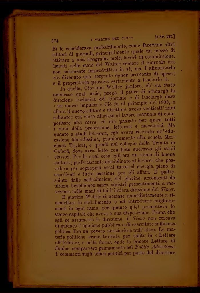 Ei lo considerava probabilmente, come facevano altri editori di giornali, principalmente quale un mezzo di attirare a una tipografia molti lavori di commissione. Quindi nelle mani del Walter seniore il giornale era non solamente improduttivo in sè, ma l'alimentarlo era divenuto una sorgente ognor crescente di spese; e il proprietario pensava seriamente a lasciarlo lì.