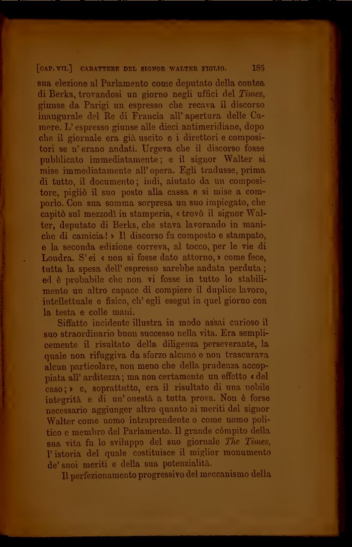 Siffatto incidente illustra in modo assai curioso il suo straordinario buon successo nella vita. Era semplicemente il risultato della diligenza perseverante, la quale non rifuggiva da sforzo alcuno e non trascurava alcun particolare, non meno che della prudenza accoppiata all' arditezza ; ma non certamente un effetto < del caso ; > e, soprattutto, era il risultato di una nobile integrità e di un' onestà a tutta prova. Non è forse necessario aggiunger altro quanto ai meriti del signor Walter come uomo intraprendente o come uomo politico e membro del Parlamento. Il grande compito della sua vita fu lo sviluppo del suo giornale The Times, l'istoria del quale costituisce il miglior monumento de' suoi meriti e della sua potenzialità.