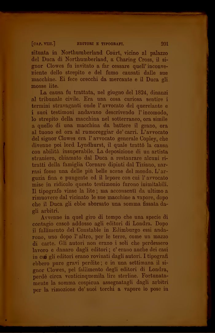 11 tipografo vinse la lite ; ma acconsentì da ultimo a rimuovere dal vicinato le sue macchine a vapore, dopo che il Duca gli ebbe sborsato una somma fissata dagli arbitri.