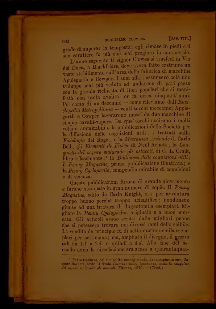 L'anno seguente il signor Clowes si trasferì in Via del Duca, a Blackfriars, dove aveva fatto costruire un vasto stabilimento sull'area della fabbrica di macchine Applegarth e Cowper. I suoi affari assunsero colà uno sviluppo mai più veduto ed andarono di pari passo con la grande richiesta di libri popolari che si manifestò con tanta avidità, or fa circa cinquant' anni. Pel corso di un decennio — come rileviamo dall'Enciclopedia Metropolitana — venti torchi meccanici Applegarth e Cowper lavorarono mossi da due macchine di cinque cavalli-vapore. Da que' torchi uscirono i molti volumi ammirabili e le pubblicazioni della Società per la diffusione delle cognizioni utili ; i trattati sulla Fisiologia del Roget, e la Meccanica Animale di Carlo Bell ; gli Elementi di Fisica di Neill Arnott ; la Conquista del sapere malgrado gli ostacoli, di G. L. Craik, libro affascinante;1 la Biblioteca delle cognizioni utili; il Penny Magatine, prima pubblicazione illustrata; e la Penny Cyclopcedia, compendio mirabile di cognizioni e di scienza.