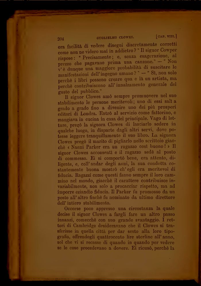 Il signor Clowes amò sempre promuovere nel suo stabilimento le persone meritevoli; uno di essi salì a grado a grado fino a divenire uno dei più prosperi editori di Londra. Entrò al servizio come fattorino, e mangiava in cucina in casa del principale. Vago di letture, pregò la signora Clowes di lasciarlo sedere in qualche luogo, in disparte dagli altri servi, dove potesse leggere tranquillamente il suo libro. La signora Clowes pregò il marito di pigliarlo nello scrittoio giacché < Nanni Parker era un ragazzo così buono ! » Il signor Clowes acconsentì e il ragazzo sedè al posto di commesso. Ei si comportò bene, era attento, diligente, e, coli'andar degli anni, la sua condotta costantemente buona mostrò ch'egli era meritevol di fiducia. Ragazzi come questi fanno sempre il loro cammino nel mondo, giacché il carattere contribuisce invariabilmente, non solo a procacciar rispetto, ma ad imporre eziandio fiducia. Il Parker fu promosso da un posto all'altro finché fu nominato da ultimo direttore dell' intiero stabilimento.