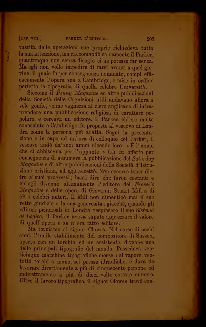 Siccome il Perniy Magatine ed altre pubblicazioni della Società delle Cognizioni utili andavano allora a vele gonfie, venne vaghezza al clero anglicano di intraprendere una pubblicazione religiosa di carattere popolare, e cercava un editore. Il Parker, ch'era molto conosciuto a Cambridge, fu proposto al vescovo di Londra come la persona più adatta. Seguì la presentazione e in capo ad un' ora di colloquio col Parker, il vescovo andò da' suoi amici dicendo loro : « È l'uomo che ci abbisogna per 1' appunto. » Gli fu offerto per conseguenza di assumere la pubblicazione del Saturday Magazine e di altre pubblicazioni della Società d'Istruzione cristiana, ed egli accettò. Non occorre tener dietro a' suoi progressi ; basti dire che furon costanti e eh' egli divenne ultimamente l'editore del Fraser's Magazine e delle opere di Giovanni Stuart Mill n di altri celebri autori. Il Mill non dimenticò mai il suo retto giudizio e la sua generosità ; giacché, quando gli editori principali di Londra respinsero il suo Sistema di Logica, il Parker aveva saputo apprezzare il valore di quell' opera e se n' era fatto editore.