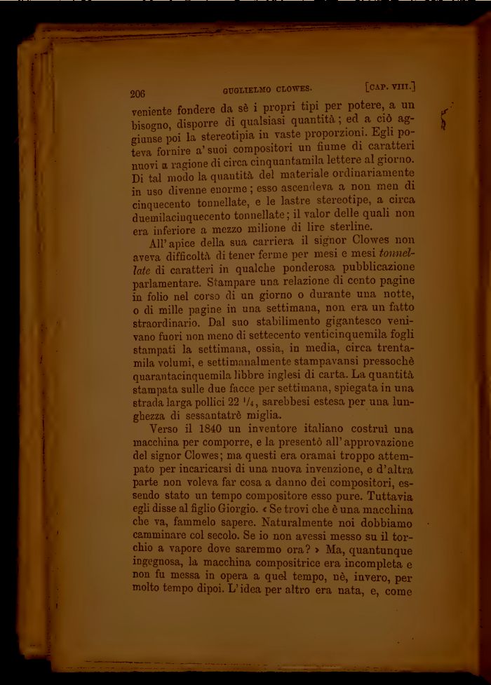 Verso il 1840 un inventore italiano costruì una macchina per comporre, e la presentò all' approvazione del signor Clowes; ma questi era oramai troppo attempato per incaricarsi di una nuova invenzione, e d'altra parte non voleva far cosa a danno dei compositori, essendo stato un tempo compositore esso pure. Tuttavia egli disse al figlio Giorgio. < Se trovi che è una macchina che va, fammelo sapere. Naturalmente noi dobbiamo camminare col secolo. Se io non avessi messo su il torchio a vapore dove saremmo ora? > Ma, quantunque ingegnosa, la macchina compositrice era incompleta e non fu messa in opera a quel tempo, né, invero, per molto tempo dipoi. L'idea per altro era nata, e, come