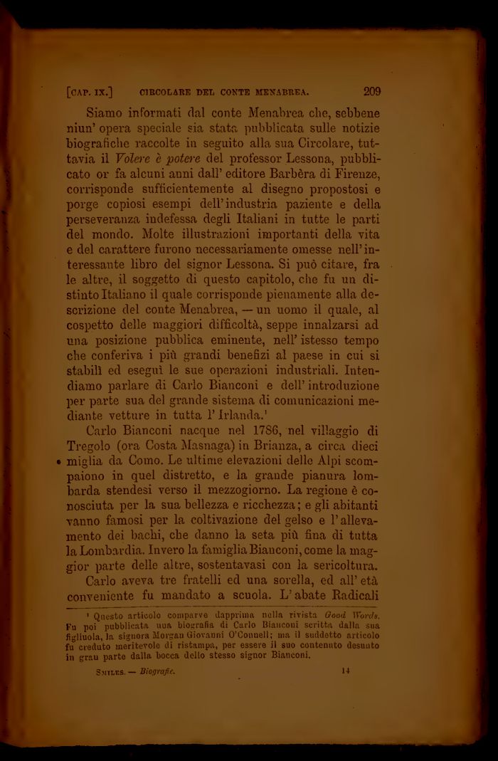 Siamo informati dal conte Menabrea che, sebbene niun' opera speciale s lei Stiltfl pubblicata sulle notizie biografiche raccolte in seguito alla sua Circolare, tuttavia il Volere è potere del professor Lessona, pubblicato or fa alcuni anni dall' editore Barbèra di Firenze, corrisponde sufficientemente al disegno propostosi e porge copiosi esempi dell'industria paziente e della perseveranza indefessa degli Italiani in tutte le parti del mondo. Molte illustrazioni importanti della vita e del carattere furono necessariamente omesse nell' interessante libro del signor Lessona. Si può citare, fra le altre, il soggetto di questo capitolo, che fu un distinto Italiano il quale corrisponde pienamente alla descrizione del conte Menabrea, — un uomo il quale, al cospetto delle maggiori difficoltà, seppe innalzarsi ad una posizione pubblica eminente, nell' istesso tempo che conferiva i più grandi benefizi al paese in cui si stabilì ed eseguì le sue operazioni industriali. Intendiamo parlare di Carlo Bianconi e dell' introduzione per parte sua del grande sistema di comunicazioni mediante vetture in tutta l'Irlanda.'