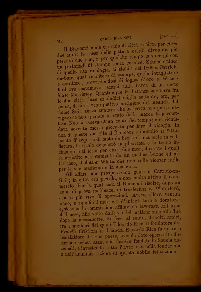 Gli affari non prosperavano guari a Carrick-on-Suir; la città era piccola, e non molto attivo il commercio. Per la qual cosa il Bianconi risolse, dopo un anno di prova inefficace, di trasferirsi a Waterford, centro più vivo di operazioni. Aveva allora venturi anno, e ripigliò il mestiere d'intagliatore e doratore; e, siccome le commissioni affluivano, lavorava coli' arco dell' osso, alle volte dalle sei del mattino sino alle due dopo la mezzanotte. Si fece, al solito, dimolti amici, fra i migliori dei quali Edoardo Rice, il fondatore dei Fratelli Cristiani in Irlanda. Edoardo Rice fu un vero benefattore del suo paese, avendo dato opera all'educazione prima assai che fossero fondate le Scuole nazionali, e investendo tutto l'aver suo nella fondazione e nell'amministrazione di questa nobile istituzione.