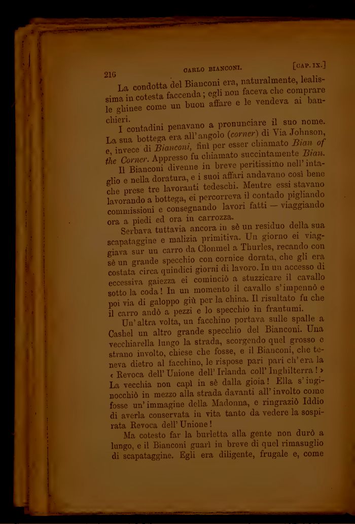 Un'altra volta, un facchino portava sulle spalle a Cashel un altro grande specchio del Bianconi. Una vecchiarella lungo la strada, scorgendo quel grosso e strano involto, chiese che fosse, e il Bianconi, che teneva dietro al tacchino, le rispose pari pari ch'era la < Revoca dell' Unione dell' Irlanda coli' Inghilterra ! > La vecchia non capì in sè dalla gioia! Ella s'inginocchiò in mezzo alla strada davanti all' involto come fosse un'immagine della Madonna, e ringraziò Iddio di averla conservata in vita tanto da vedere la sospirata Revoca dell' Unione !