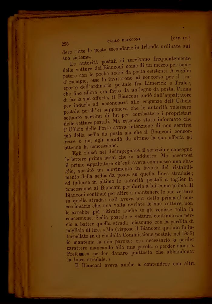 Le autorità postali si servivano frequentemente delle vetture del Bianconi come di un mezzo per competere con le poche sedie da posta esistenti. A cagiou d'esempio, esse lo invitarono al concorso per il trasporto dell'ordinario postale fra Limerick e Tralee, clie fino allora era fatto da un legno da posta. Prima di far la sua offerta, il Bianconi andò dall'appaltatore per indurlo ad acconciarsi alle esigenze dell' Ufficio postale, perch' ei supponeva che le autorità volessero soltanto servirsi di lui per combattere i proprietari delle vetture postali. Ma essendo stato informato che 1' Ufficio delle Poste aveva intenzione di non servirsi più della sedia da posta sia che il Bianconi concorresse o no, egli mandò da ultimo la sua offerta ed ottenne la concessione.