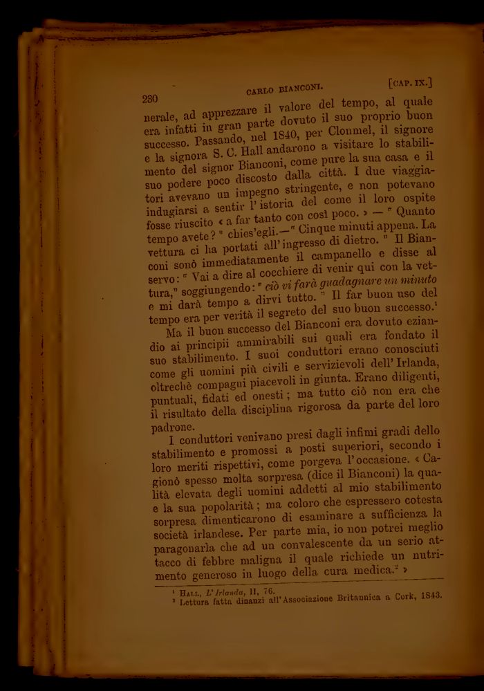 I conduttori venivano presi dagli infimi gradi dello stabilimento e promossi a posti superiori, secondo i loro meriti rispettivi, come porgeva l'occasione. «Cagionò spesso molta sorpresa (dice il Bianconi) la qualità elevata degli uomini addetti al mio stabilimento e la sua popolarità ; ma coloro che espressero cotesta sorpresa dimenticarono di esaminare a sufficienza In società irlandese. Per parte mia, io non potrei meglio paragonarla che ad un convalescente da un serio attacco di febbre maligna il quale richiede un nutrimento generoso in luogo della cura medica.2 >