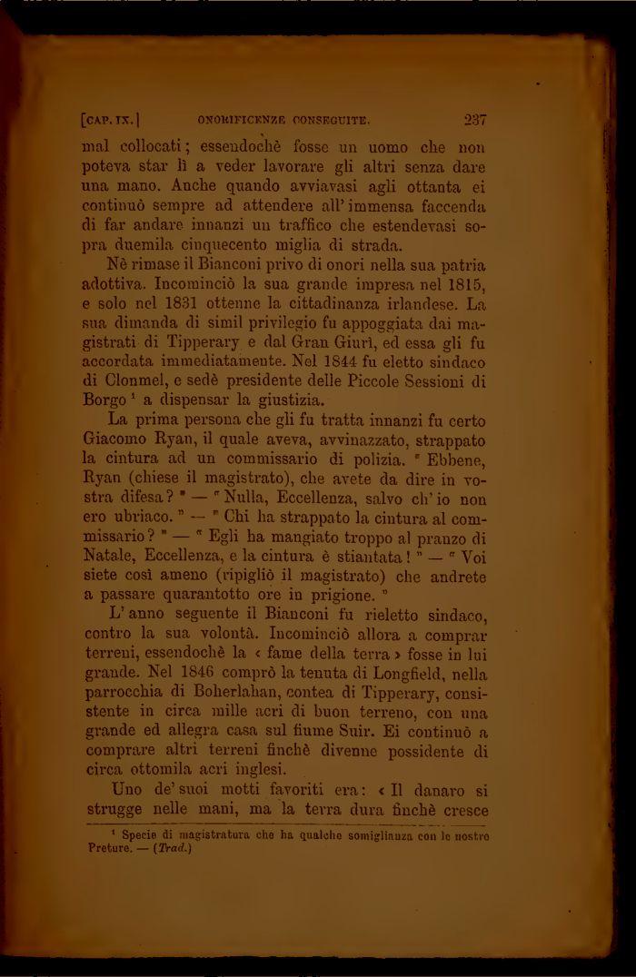 L'anno seguente il Bianconi fu rieletto sindaco, contro la sua volontà. Incominciò allora a comprar terreni, essendoché la < fame della terra > fosse in lui grande. Nel 1846 comprò la tenuta di Longfield, nella parrocchia di Boherlahan, contea di Tipperary, consistente in circa mille acri di buon terreno, con una grande ed allegra casa sul fiume Suir. Ei continuò a comprare altri terreni finché divenne possidente di circa ottomila acri inglesi.