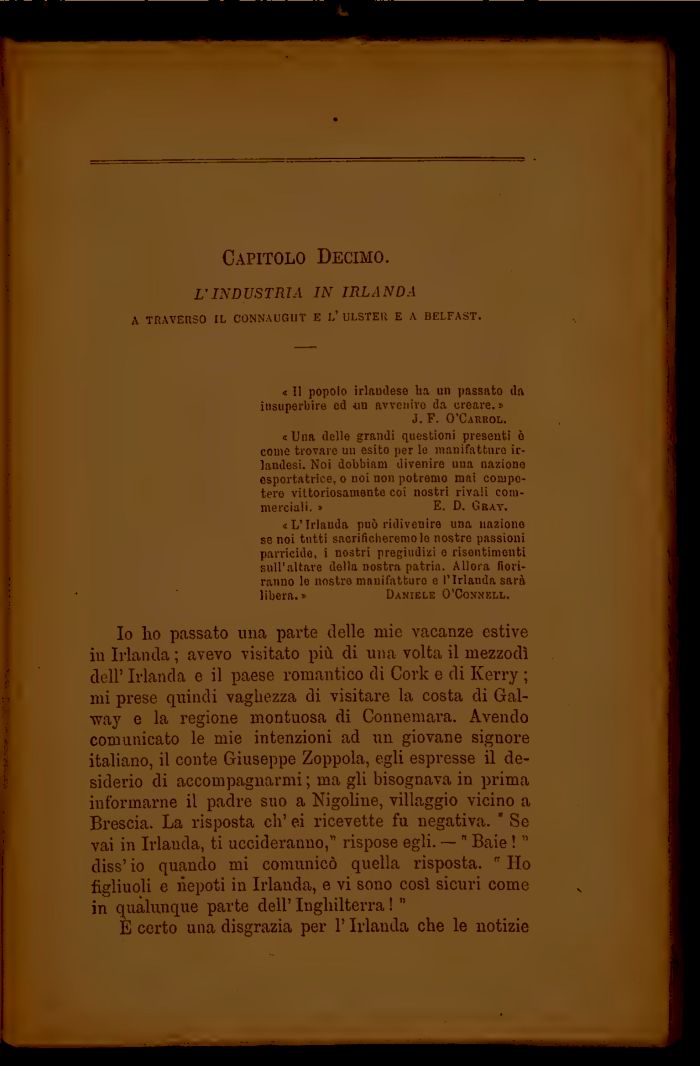Io lio passato una parte delle mie vacanze estive iu Irlanda ; avevo visitato più di una volta il mezzodì dell' Irlanda e il paese romantico di Cork e di Kerry ; mi prese quindi vaghezza di visitare la costa di Gal-way e la regione montuosa di Connemara. Avendo comunicato le mie intenzioni ad un giovane signore italiano, il conte Giuseppe Zoppola, egli espresse il desiderio di accompagnarmi ; ma gli bisognava in prima informarne il padre suo a Nigoline, villaggio vicino a Brescia. La risposta eh' ei ricevette fu negativa. Se vai in Irlanda, ti uccideranno, rispose egli. — Baie ! diss' io quando mi comunicò quella risposta. Ho figliuoli e ìiepoti in Irlanda, e vi sono così sicuri come in qualunque parte dell' Inghilterra !